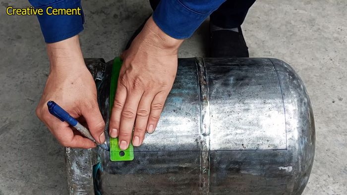 После этого размечаем на баллоне две большие дверцы. Вырезаем их, но не до конца. Расстояние между дверцами делаем 125 мм.