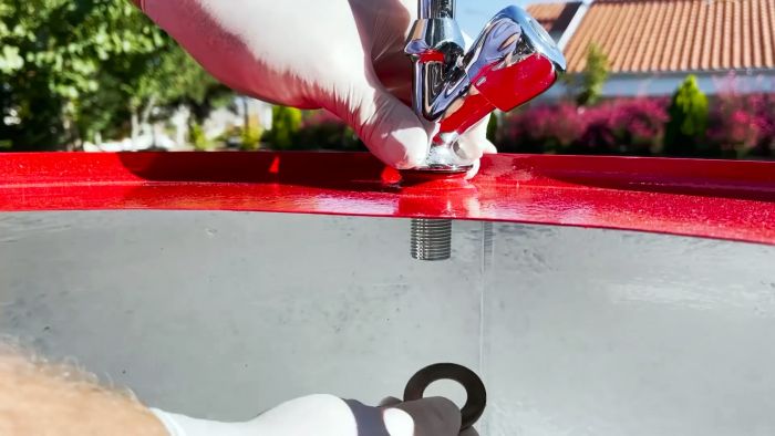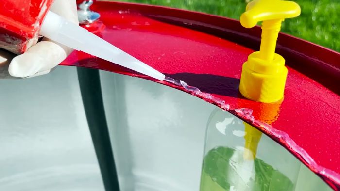 Для этого конец гофра через нижнее отверстие в бочке выводим наружу. Раковина полностью готова к применению по прямому назначению.