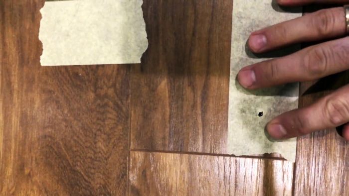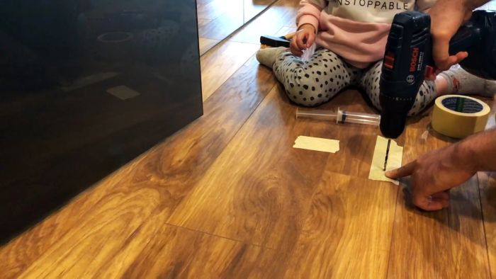 Первым делом находим места, где скрипит пол, и определяем центр углубления под ними. Затем приклеиваем сверху небольшой кусок малярной ленты. Далее просверливаем ламинат сквозь скотч, и убираем стружку пылесос.