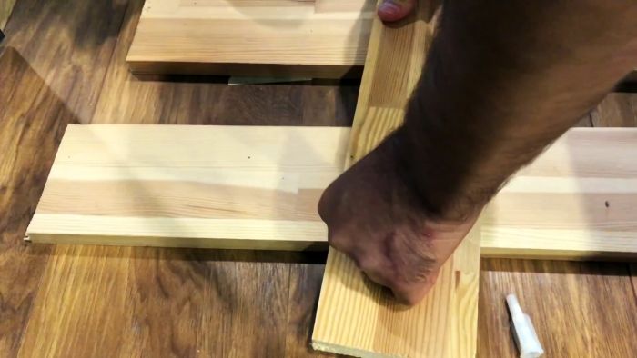Как только мы убедились, что клея достаточно и впадина полностью заполнена, ставим на доски груз. Не убираем его, пока жидкие гвозди не высохнут.