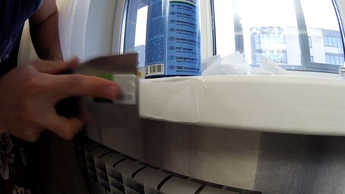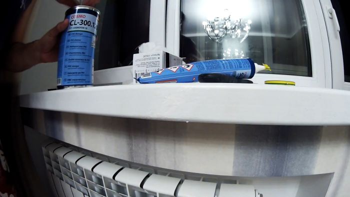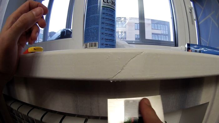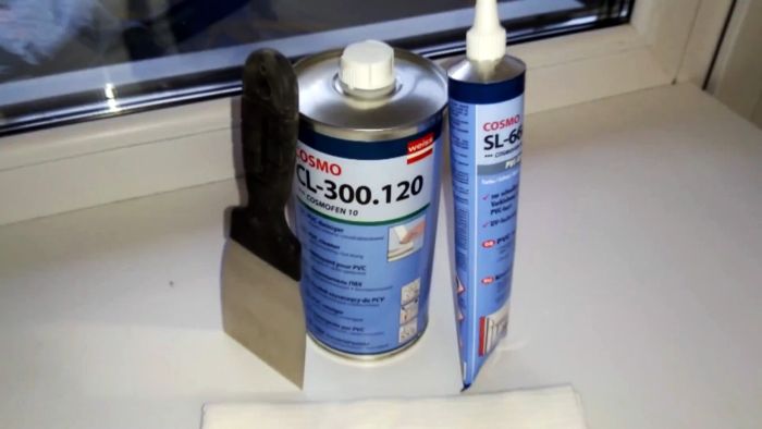 Дефект на подоконнике необходимо обработать очистителем. Вещество имеет едкий запах, поэтому важно обеспечить хорошее проветривание. Cosmofen не просто очищает поверхность, а слегка размягчает ПВХ, обеспечивая тем самым сверхпрочное прилипание жидкого пластика. Важно пользоваться только белой тряпкой, чтобы не испачкать подоконник ее красителем.