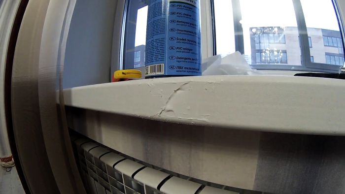 После этого можно протереть уже весь подоконник очистителем, чтобы тот полностью стал белым как отремонтированный участок. Вот так быстро и просто можно заделать не только трещину, но и пробоину в подоконнике.