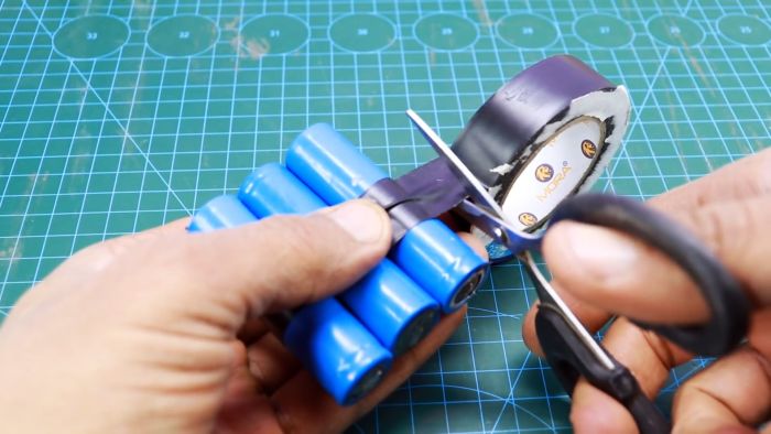 В качестве аварийного источника питания для роутера послужат 3 аккумулятора типа 18650. Выставляем их ровно, чередуя полярность, и соединяем изолентой.