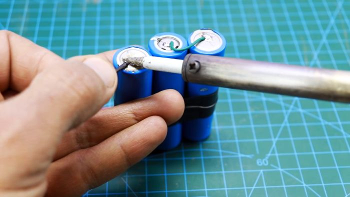 Затем подключаем аккумуляторы последовательно, объединив тем самым их напряжение. Паяем провода просто на клеммы.