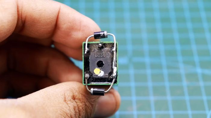 Далее нужно заняться узлом переключения между сетевым напряжением и аварийным. Для этого используется реле на 12В. К нему согласно схеме припаивается два диода.
