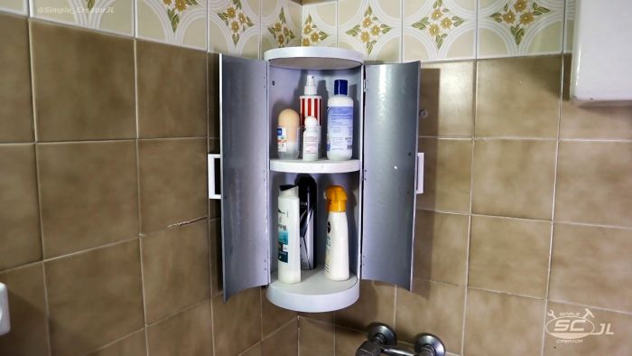 Устанавливаем после высыхания краски дверцы на место, прикручиваем к ним ручки и тумбу крепим в углу ванны каким-либо способом. В шкафчики можно хранить различные средства по уходу за волосами, кожей тела и т. д.