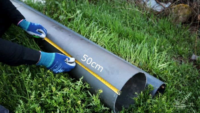 От края трубы отмеряем кусок длиной 50 см и отрезаем его ножовкой.