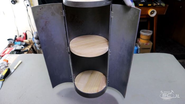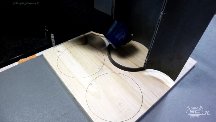 Выполняем поперечные прорези по кольцевым окружностям в пределах боковых продольных линий, а также по центральной продольной линии. Не пропилы устраняем полотном ножовки. В результате получились две распахивающиеся створки благодаря карточным петлям для мебели.