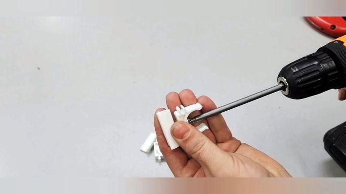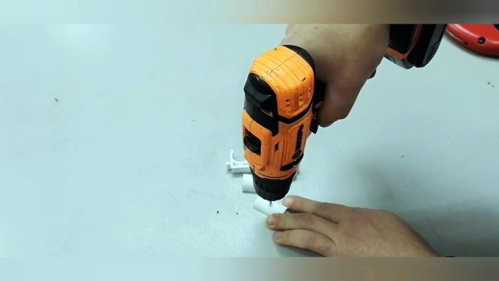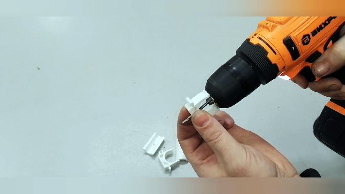 При помощи самореза соединяем клипсу с половинчатым обрезком трубы. До конца не доворачиваем.