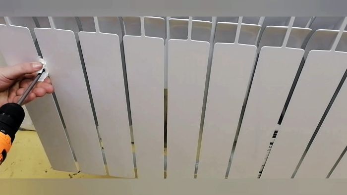 Получившийся держатель просовываем через щель стенок радиатора на необходимую высоту. Фиксируем докручивая саморез.