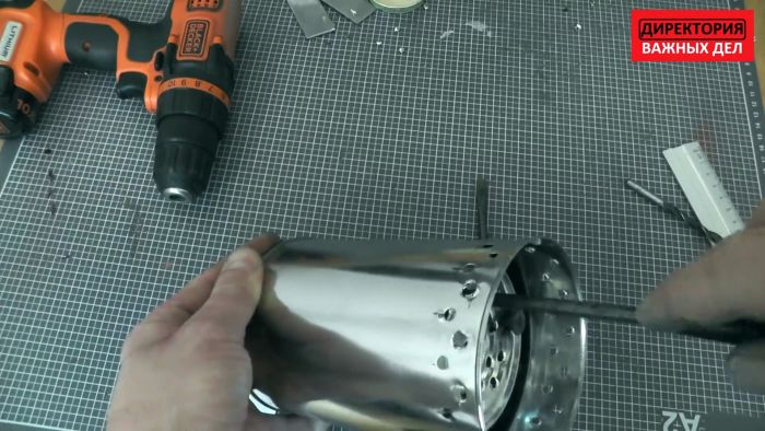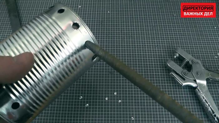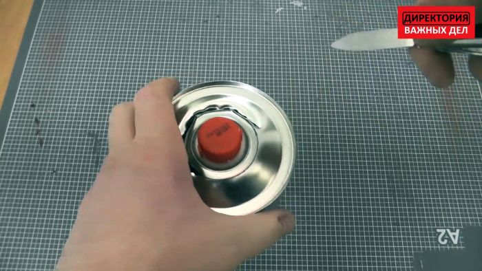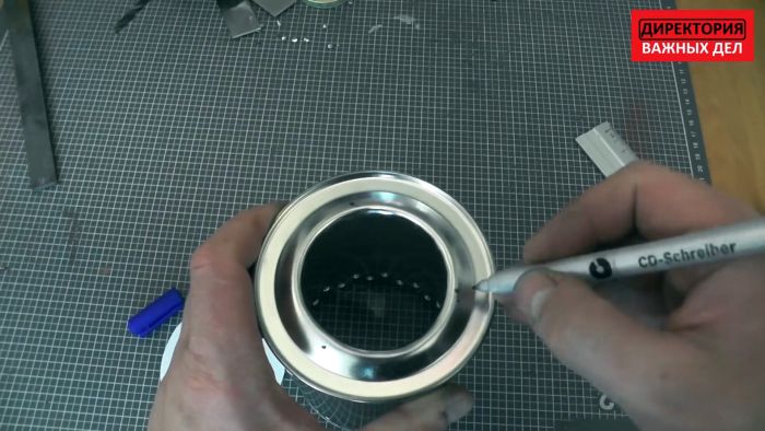 Далее предстоит просверлить банку от отвердителя в крышке. Делается три отверстия для треноги. Они переносятся также и на дно банки от консервов.