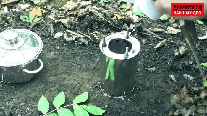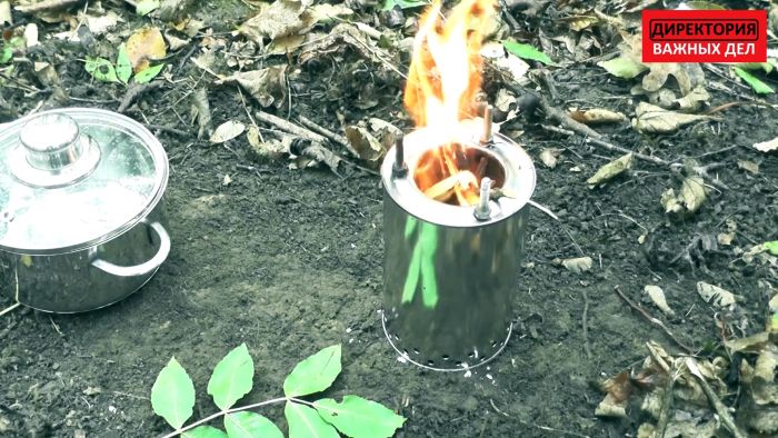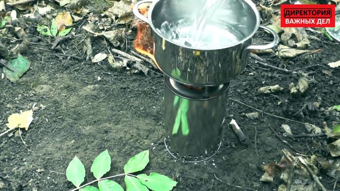 Готовая печка устанавливается на ровное основание. Во внутреннюю банку накидываем щепки, и поджигаем их. После того как стенки разогреются, выброс дыма из печки прекращается. Теперь на нее можно ставить котелок или сковородку. Такая печка при использовании горсточки веток способна вскипятить литр воды за 15 мин, поэтому конструкция очень полезная для туриста, охотника или рыбака.