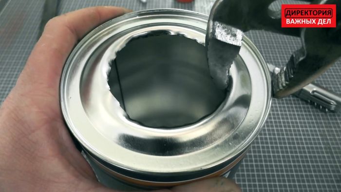 Полученный рваный край необходимо подровнять переставными клещами или другим инструментом. Также у банки от отвердителя удаляется дно.