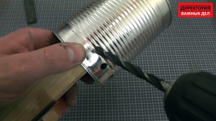 Теперь нужно заняться второй банкой. Сначала аккуратно убираем ее крышку. После этого нужно сделать перфорацию у дна и верхнего края банки по кругу большим сверлом. Лучше всего использовать сверло по дереву, подкладывая изнутри брусочек. Оно не оставляет рваных краев. Также следует сделать решето в дне банки.