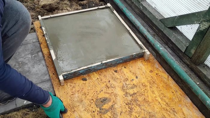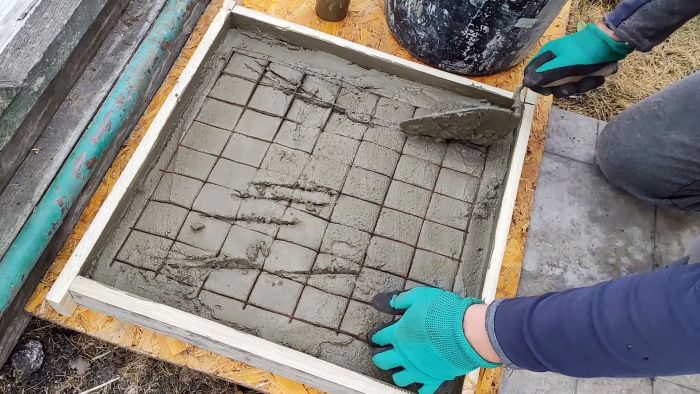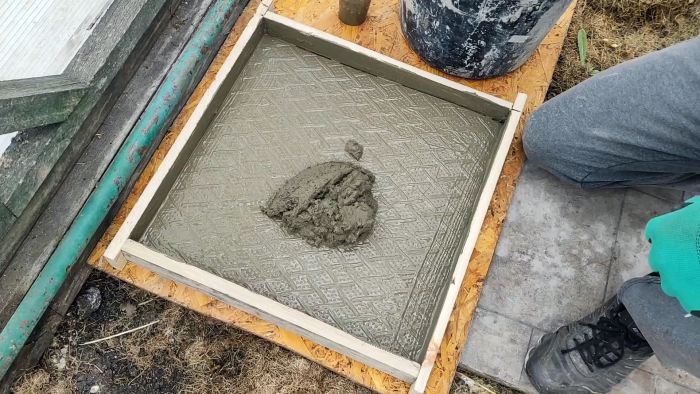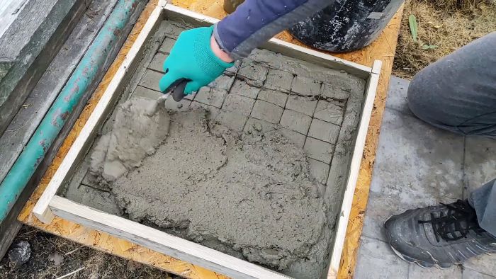 Под нее из рейки собирается на саморезы квадратная опалубка. Плитка должна входить в нее впритирку.
