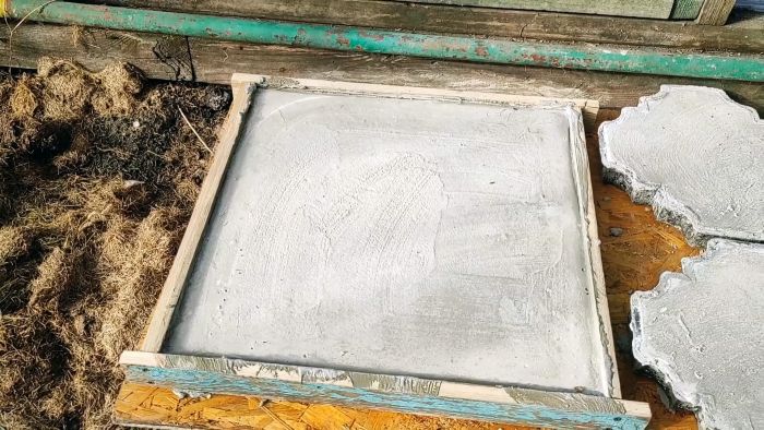 Бывает, что на готовой плитке остается окантовка из наплывов. Пока бетон еще не окончательно затвердел, ее легко убрать шпателем. Также она хорошо сошлифовывается. Вот таким образом можно сделать нужное количество плиток толщиной 50-65 мм, потратив на формы сущие копейки.
