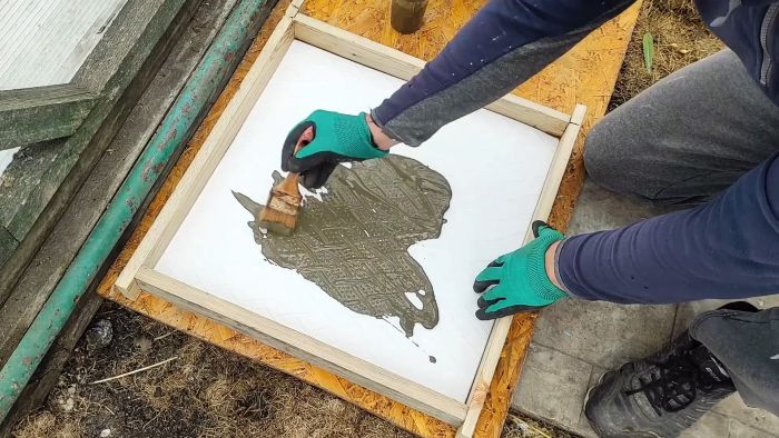 Устанавливаем нашу форму на ровное основание, и заливаем в нее немного раствора цемента с водой. Теперь распределяем его тонким слоем по всей поверхности с помощью кисти.