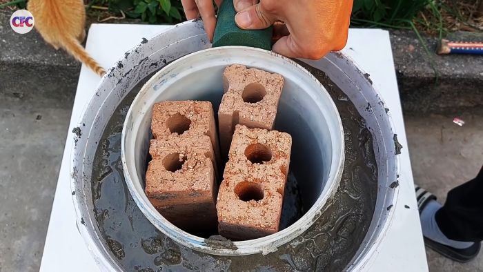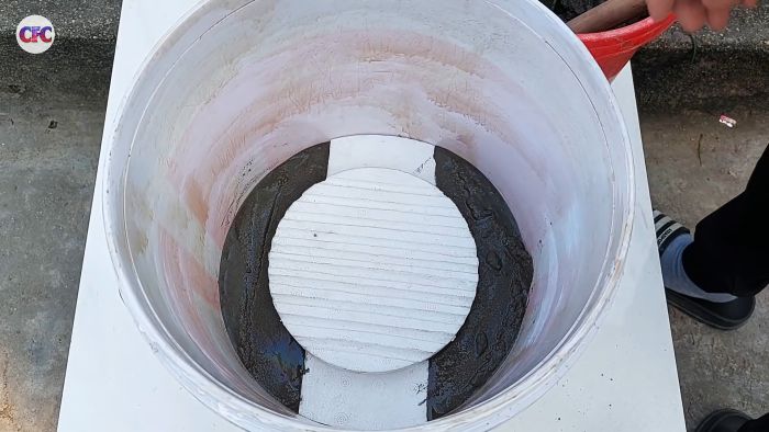 Затем заливается бетон с боков от закладной, чтобы сверху она осталась чистой. После этого укладывается круглая закладная из пенопласта с бороздками для колосников. Ее размер должен соответствовать дну меньшего пластикового ведра. С боков ее нужно залить бетоном.