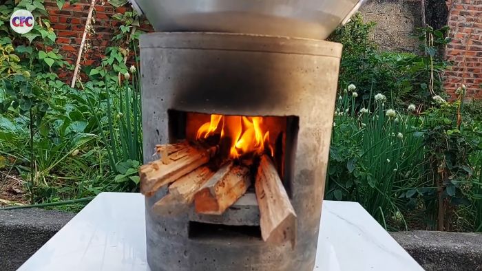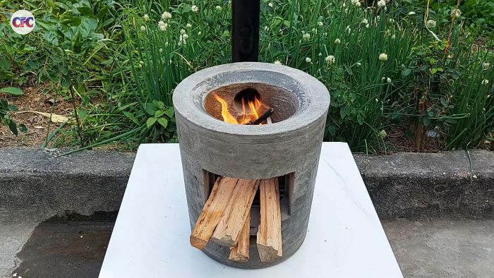 Для готовки на улице можно сделать небольшую дровяную печь из бетона. Она компактная, экономичная и очень удобная. При этом ее без проблем можно переносить по участку на руках без тележки.