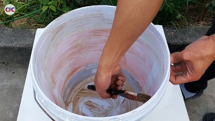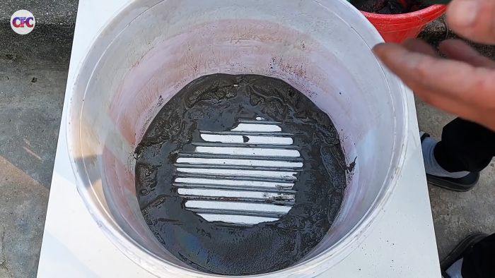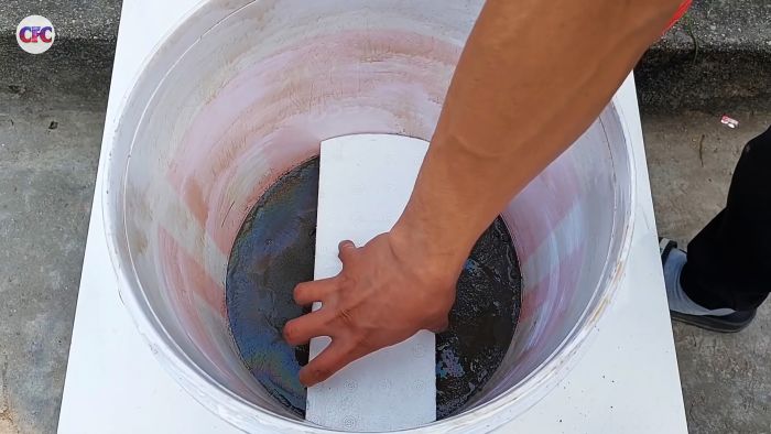 Первым делом берем большое пластиковое ведро, и смазываем его изнутри отработкой.