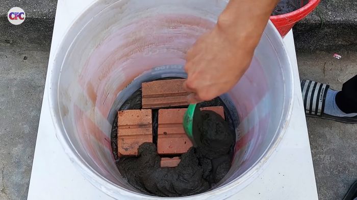 К ней вплотную прислоняется меньшее пластиковое ведро, которое следует загрузить кирпичом или камнем. Его предварительно нужно смазать сверху отработкой.