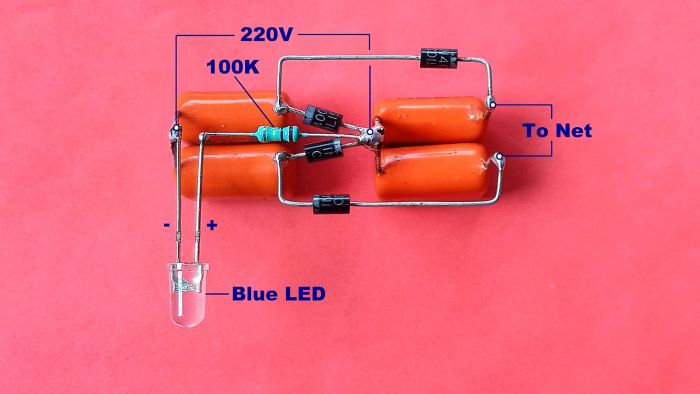 Далее припаиваем дополнительно еще два конденсатора и два выпрямительных диода, как показано на фото. Также включаем в схему резистор и синий светодиод.