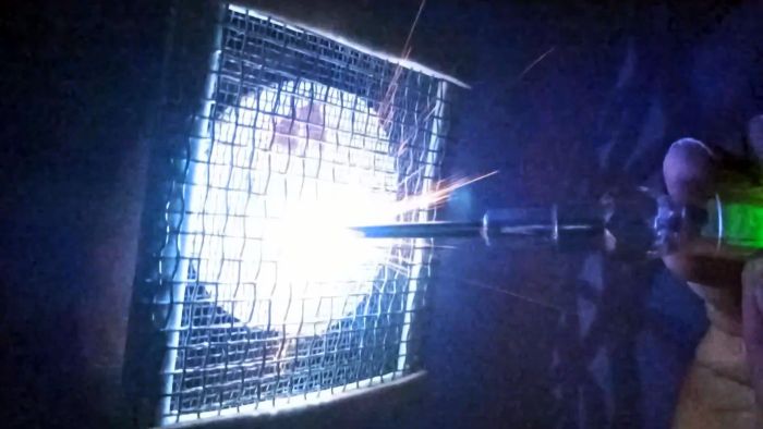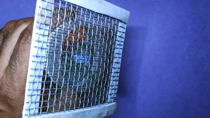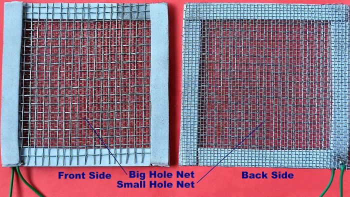 Далее изготавливаем сетчатые электроды. Для этого соединяем две стальных сетки с мелкой ячейкой, проложив между ними по периметру диэлектрический материал. Наружная сетка делается с немного большей ячейкой, чем внутренняя. К сеткам припаиваются провода.