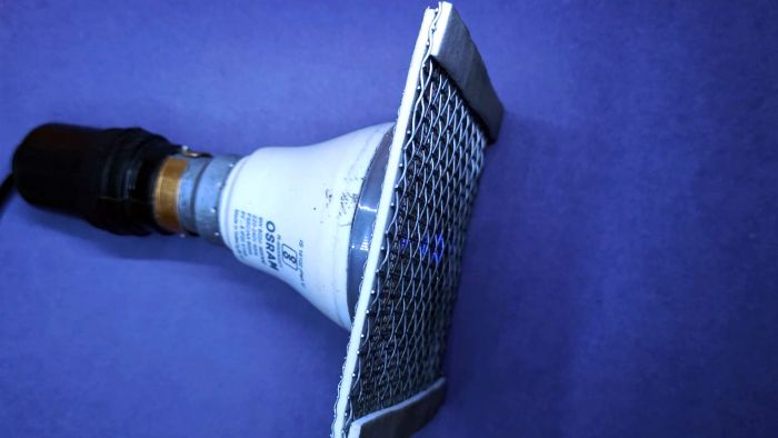 Теперь при вкручивании устройства в патрон светодиод будет издавать синее свечение, приманивающее насекомых. Как только комар коснется одновременно наружной и внутренней ячейки, его убьет электрический разряд.