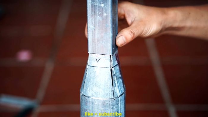 Приставляем квадратную трубу к квадрату круглой трубы и убеждаемся в их полном совпадении. После этого круглую и квадратную трубу можно заварить или припаять, получив прочное и герметичное соединение.