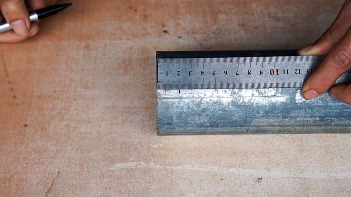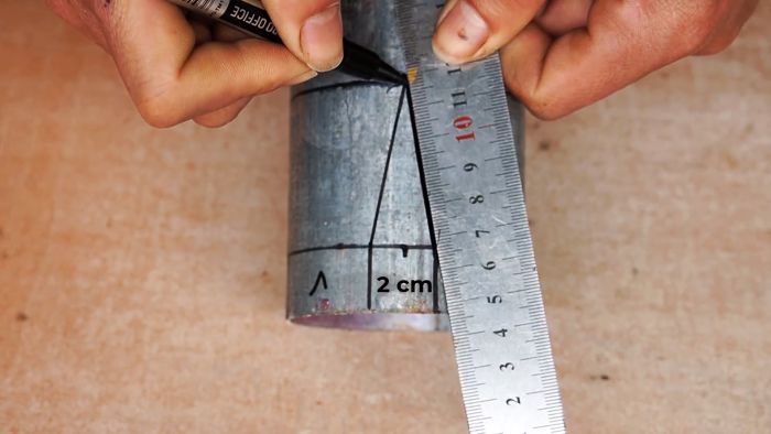 Снаружи круглой трубы откладываем от конца 2 см и ставим метку.