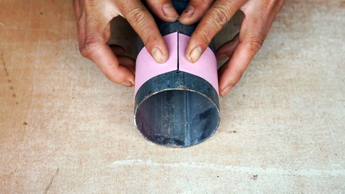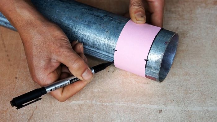 Переносим все метки с обеих боковых сторон бумажной полоски на поверхность трубы и одновременно проводим две окружности, пользуясь ее боковыми сторонами. На окружностях должно быть по четыре совпадающие метки.
