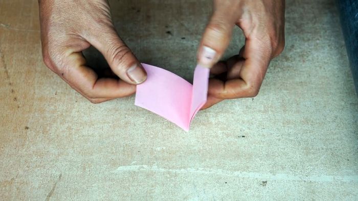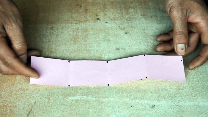 Складываем бумажную полоску два раза по длине, как можно точнее. Отмечаем точками три получившиеся от двойного сложения вертикальные линии снизу и сверху, а также с обеих сторон полоски.