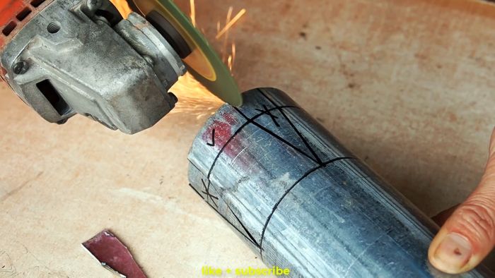 Вырезаем с помощью болгарки 4 участка, помеченных крестиками. По окружности, более удаленной от торца трубы, выполняем несквозное кольцевое углубление.