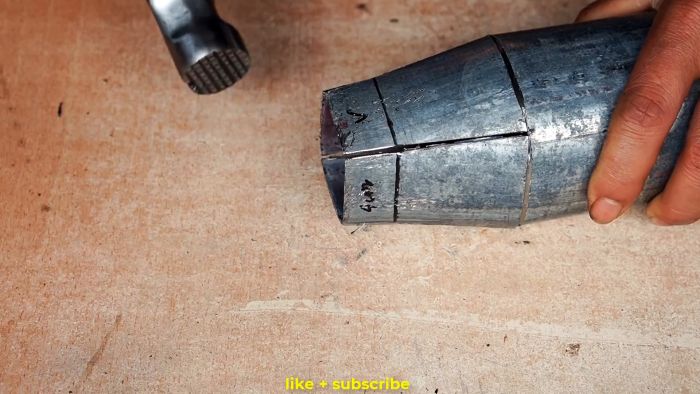 Четыре участка (лепестка), отмеченных галочками, сгибаем к центру трубы, ударяя по их концам молотком. При этом изгиб происходит по кольцевому углублению, выполненному ранее болгаркой.
