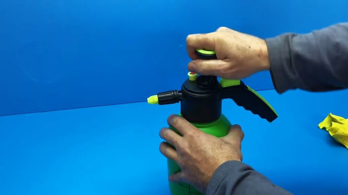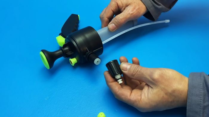 На весь процесс переделки уйдет не более 5 минут. Откручиваем бак распылителя.