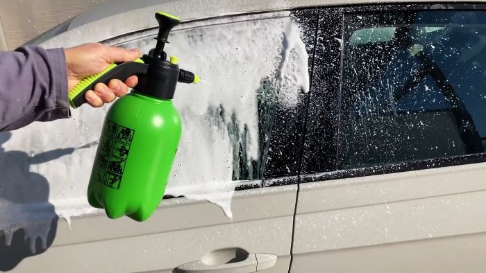 Распыляем пену на автомобиль. Это очень легко, быстро и экономно.