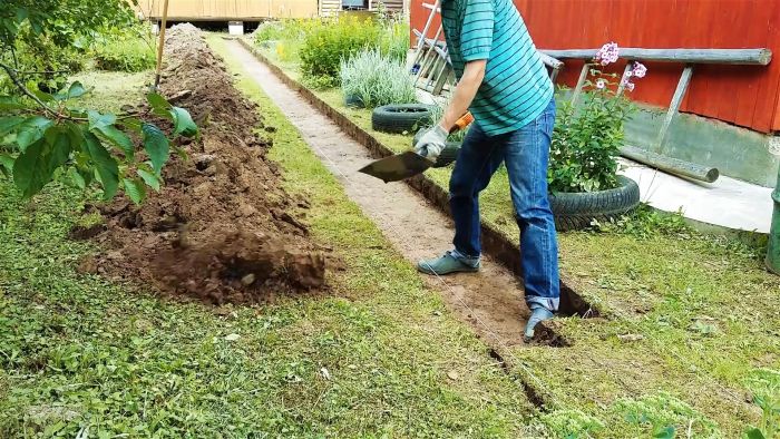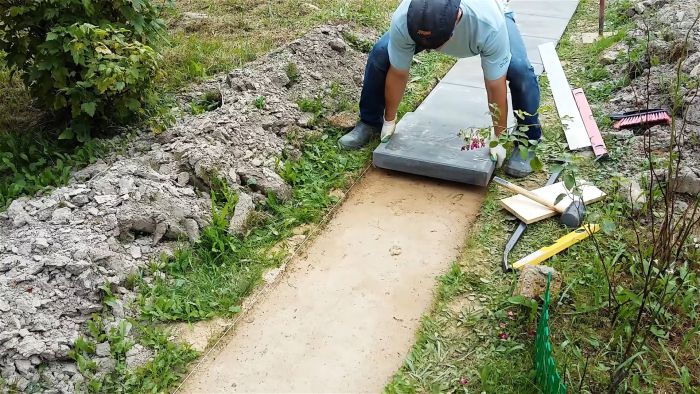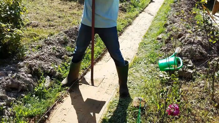 Работу нужно начать с разметки дорожки. По ней натягиваются 2 шнурки. Расстояние между веревками должно быть немного большим, чем ширина плит. Между шнурками нужно убрать плодородную почву с корнями. Для удобства грунт лучше надрезать лопатой вдоль и поперек шнурки, чтобы потом легко подбирать и отбрасывать.