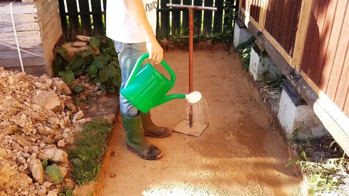 Вместо выбранного грунта в траншею засыпается песок. Его нужно утрамбовать. Поэтому лучше всего это делать послойно, насыпая за раз не более 10 см песка. Перед трамбовкой его следует обильно проливать водой из садовой лейки. Тогда он уплотнится лучше.