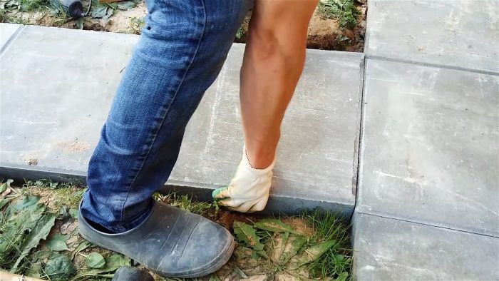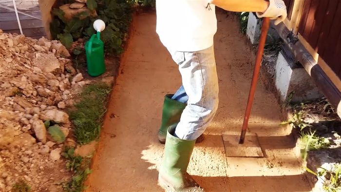 Слой за слоем набираем нужный уровень песчаный подложки. Перед каждым проходом трамбовкой следует подливать воду. В итоге плиты должны оказаться немного выше уровня грунта за шнуркой. Это исключит застой воды на дорожках.