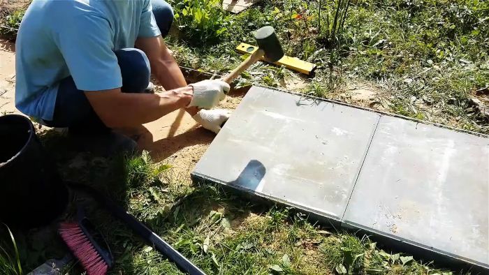 Так как она имеет отклонения по толщине, то даже на идеальной подложке будут образовываться ступеньки. Чтобы их не было, придется подсыпать или убирать песок слоем в пару миллиметров. Это удобно делать шпателем. После добавления песка, даже тонким слоем, его нужно утрамбовывать.