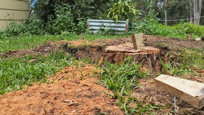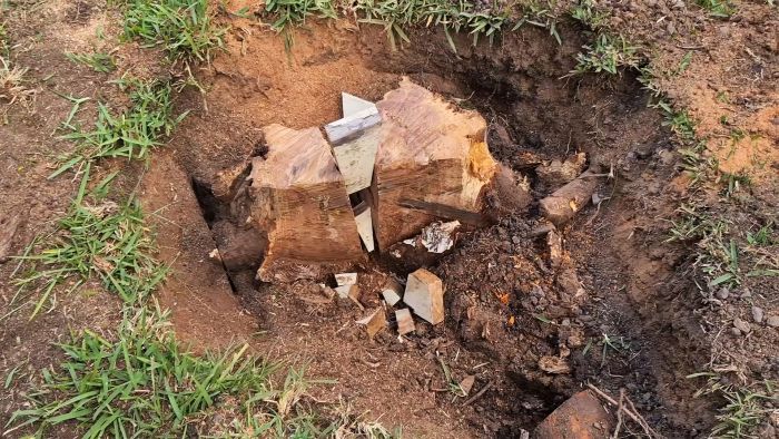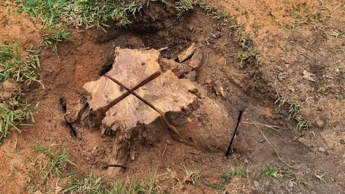 Процесс удаления пней на участке с помощью деревянных клиньев