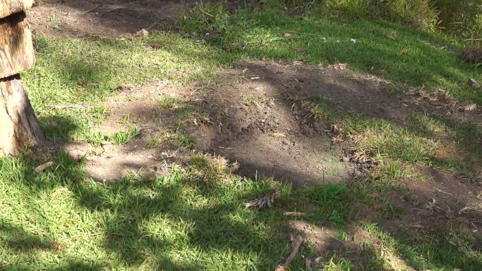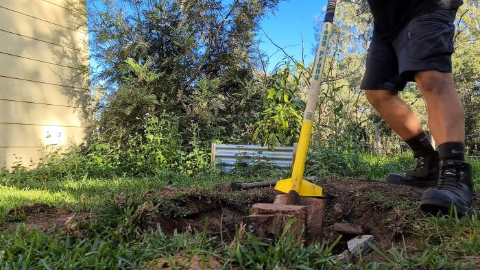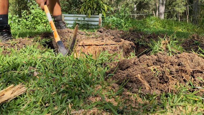 Далее раскапываем землю вокруг пня, во-первых, для того, чтобы была возможность безопасно и без повреждений поработать бензопилой, во-вторых, обнаружить основные корневые ответвления, которых обычно бывает 4 или 5.