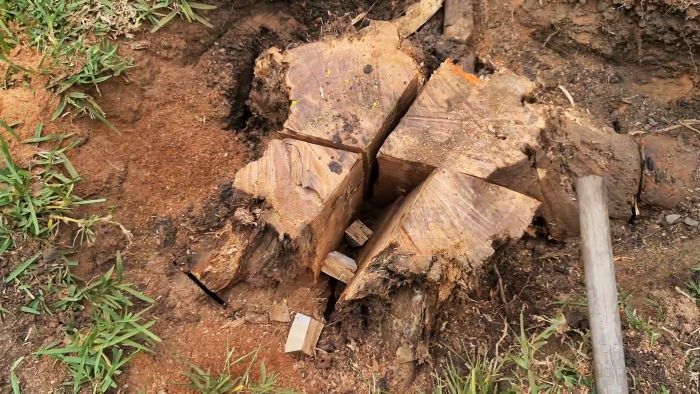 Именно, отделив пень от этих основных корневых ответвлений, мы выполним поставленную задачу. Но некоторые из ответвлений настолько мощные, что их придется отрезать от пня.