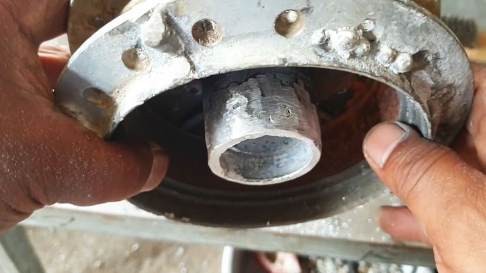 После частичного заваривания выемки, удаляем отрезок трубы из нержавейки. Это получается легко, поскольку жидкий алюминий не приваривается к нержавеющей стали, причем с гладкой поверхностью. Затем продолжаем наплавку до полного заваривания поврежденного участка и выхода наплавки на уровень несколько выше целых участков торца ступицы.