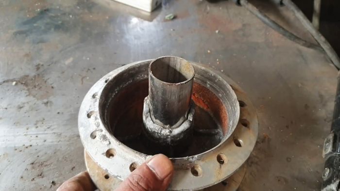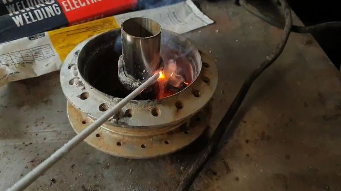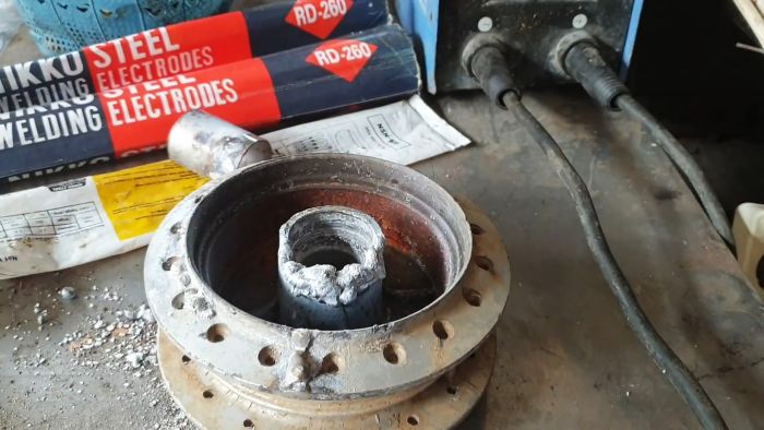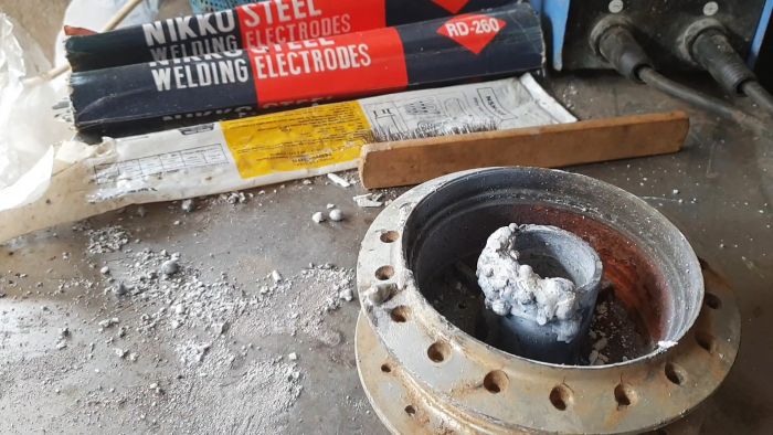 Откладываем в сторону электроды по стали и чугуну и пользуемся только электродами по алюминию. Начинаем послойно заваривать поврежденный участок ступицы, используя трубу из нержавейки в качестве внутренней формообразующей поверхности.