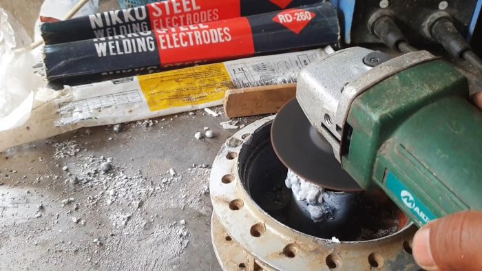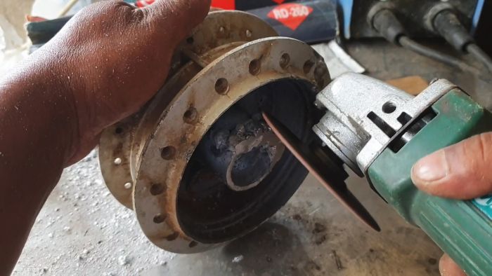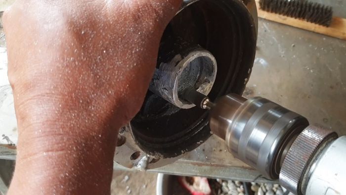 С помощью болгарки снаружи и дрели внутри удаляем лишнюю наплавку, чтобы оставшийся наплавленный алюминий по внутреннему и внешнему диаметру, высоте, а также по толщине стенки, был идентичным соответствующим размерам неповрежденной части ступицы.
