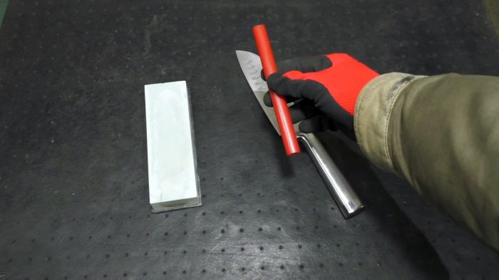 Затем трубка надевается на обух тупого ножа, который требуется заточить.