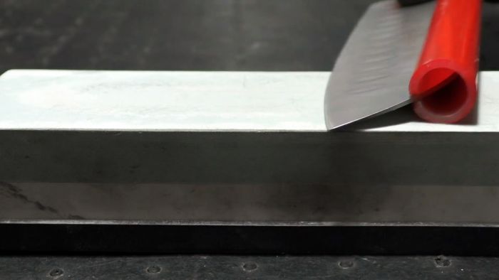 Теперь упираясь в точильный камень кромкой ножа и трубкой, можно всегда удерживать одинаковый угол. После этого точим нож сначала с одной стороны, затем с другой. В финале обязательно ведем его режущей кромкой вперед.