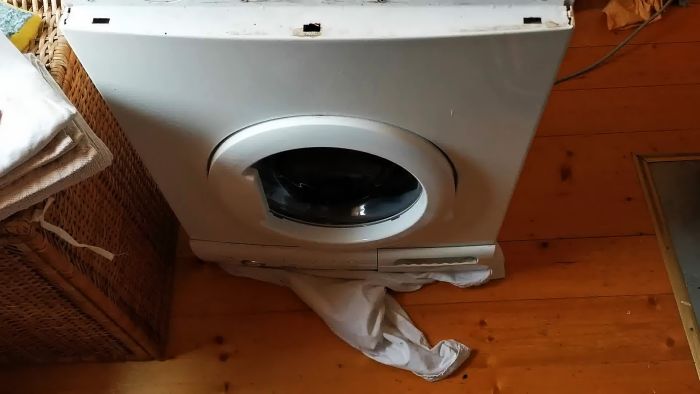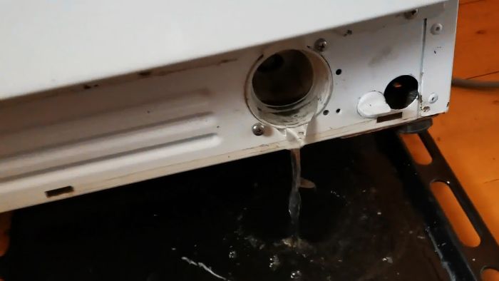 Если ножки стиральной машины отрегулированы правильно, и она стоит устойчиво, то причина ее скачков при отжиме в амортизаторах. Проблема решается их обслуживанием. Для этого для начала необходимо подцепить отверткой панель внизу машинки под дверцей загрузки белья. Ее нужно снять, чтобы открыть сливное отверстие. Из него выкручивается пробка. Требуется слить остаток воды из машинки в невысокую емкость, подставленную под отверстие.