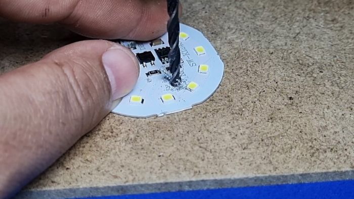 Сбоку в корпусе лампы сверлим отверстие под переменный резистор.